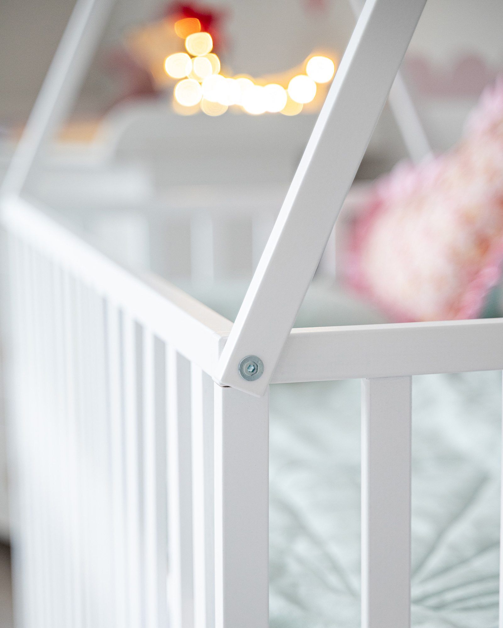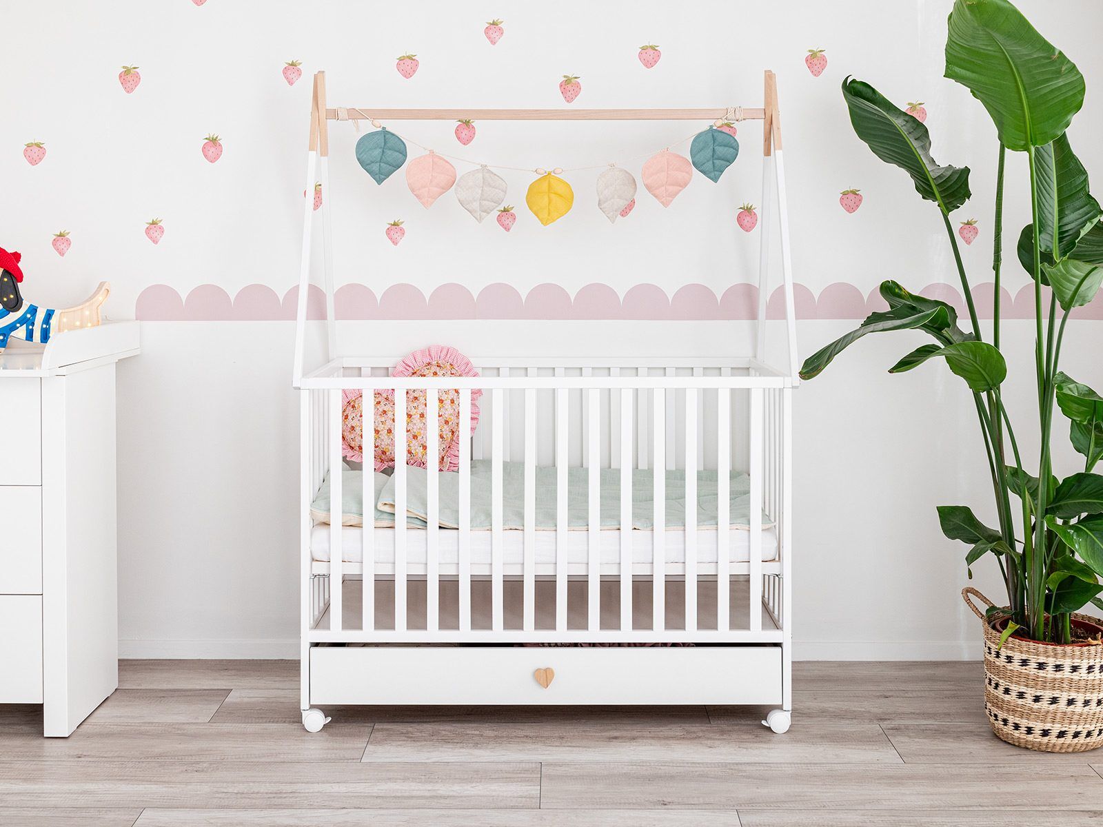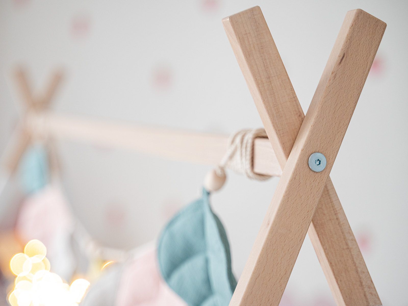 The tipi-style frame above the cot gives the room a cozy and creative character. It can be used to hang a canopy, soft toys, or garlands — anything that captures your baby’s attention and supports sensory development. The minimalist Scandinavian form fits beautifully into both modern and classic interiors.