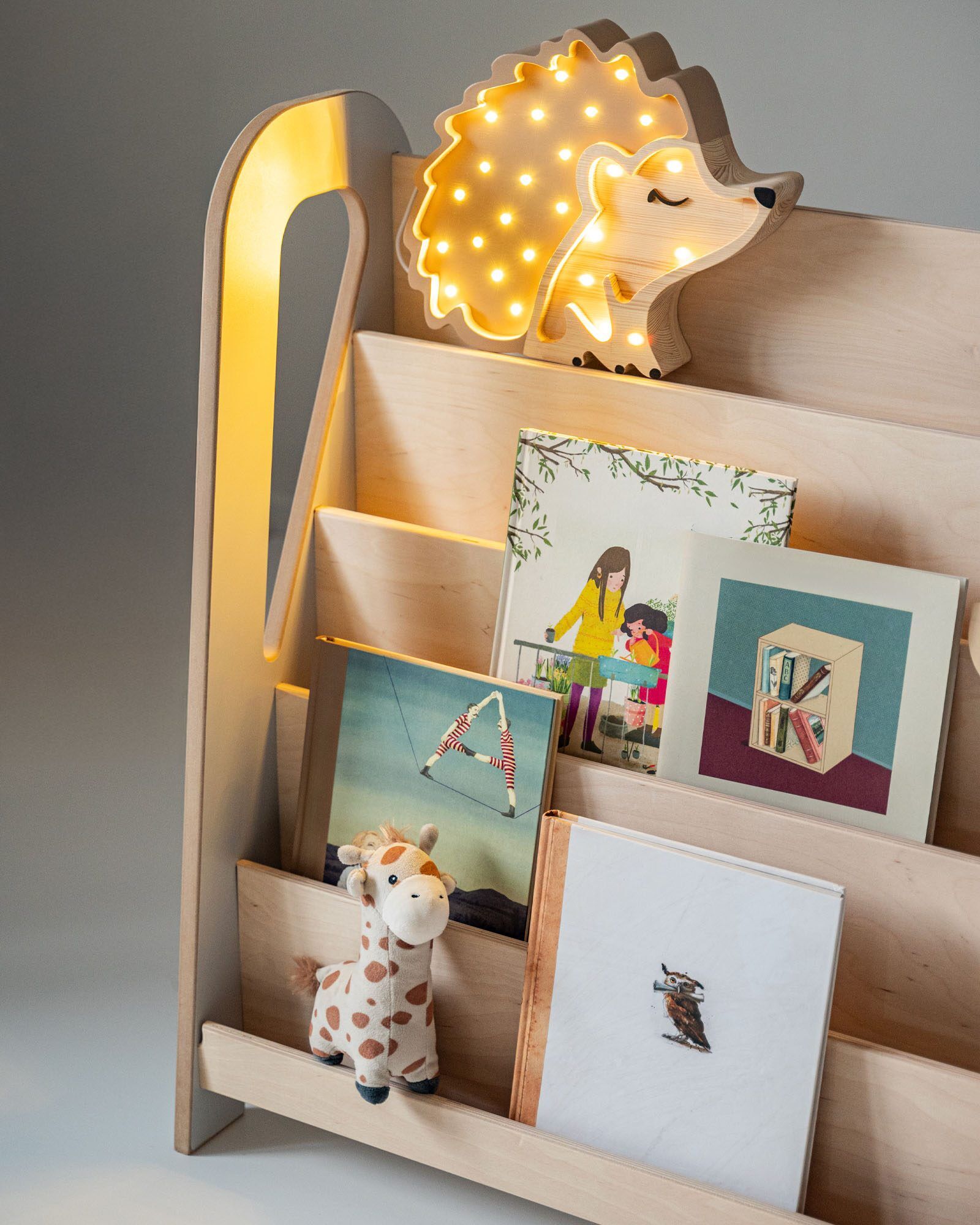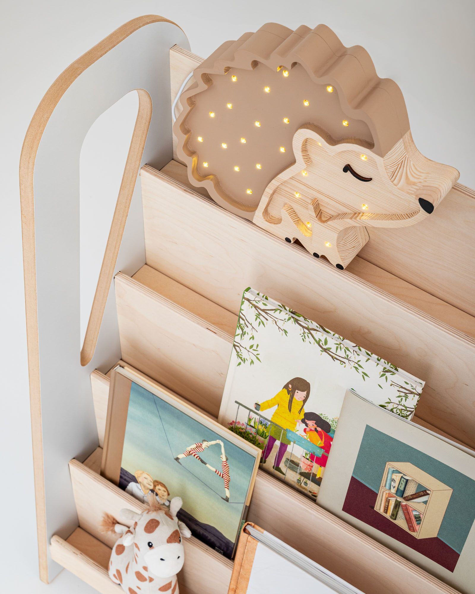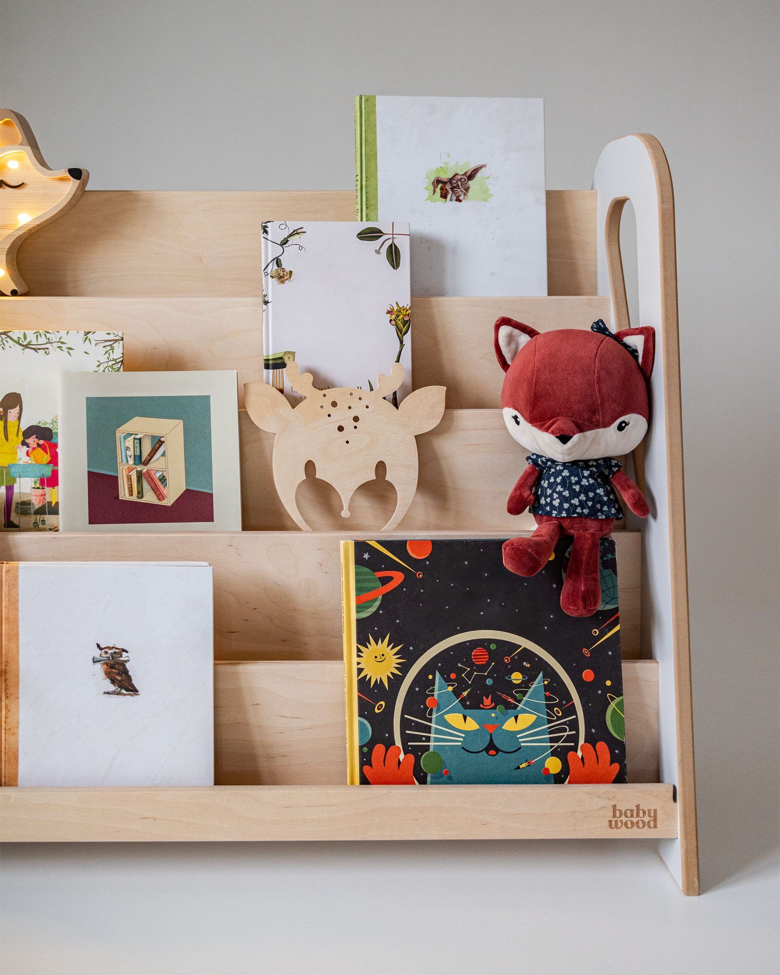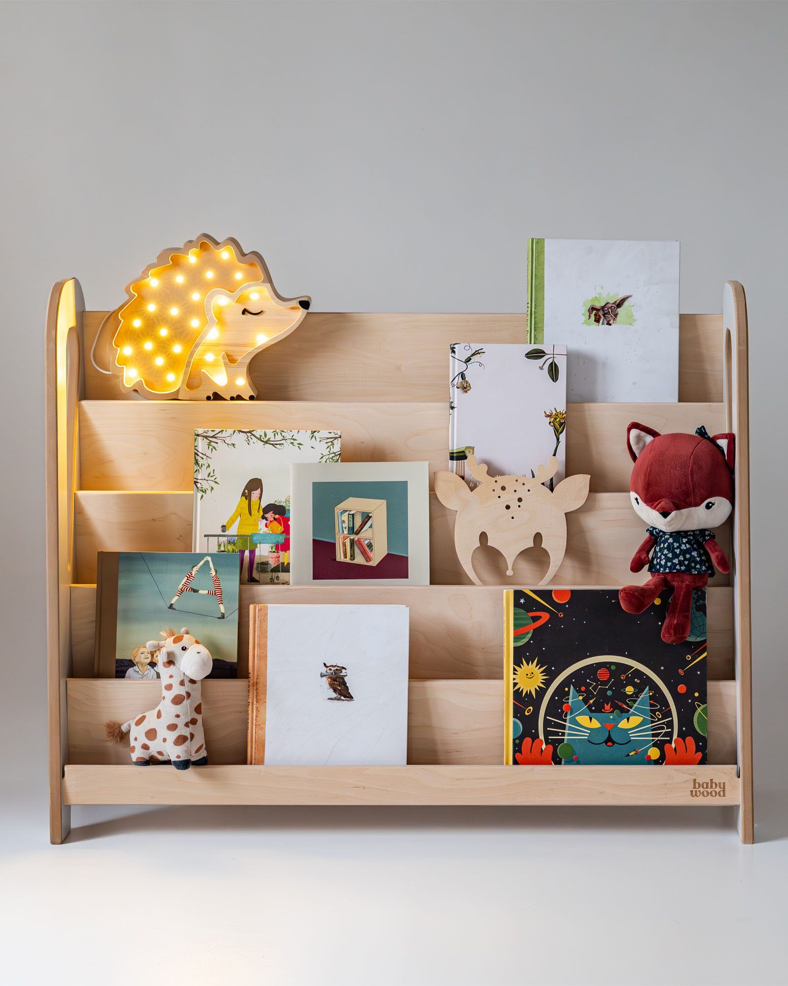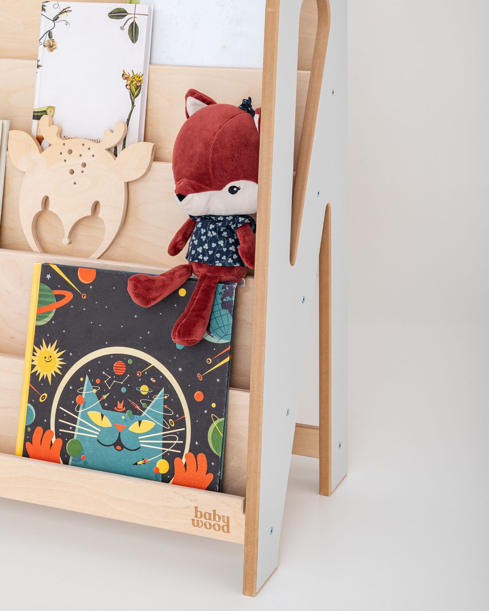 The front-facing display encourages children to reach for their favorite books, while the ergonomic height supports daily independence. Its simple construction and natural design make it a perfect match for modern interiors, easily customized with side panels available in natural, white, black, or grey.