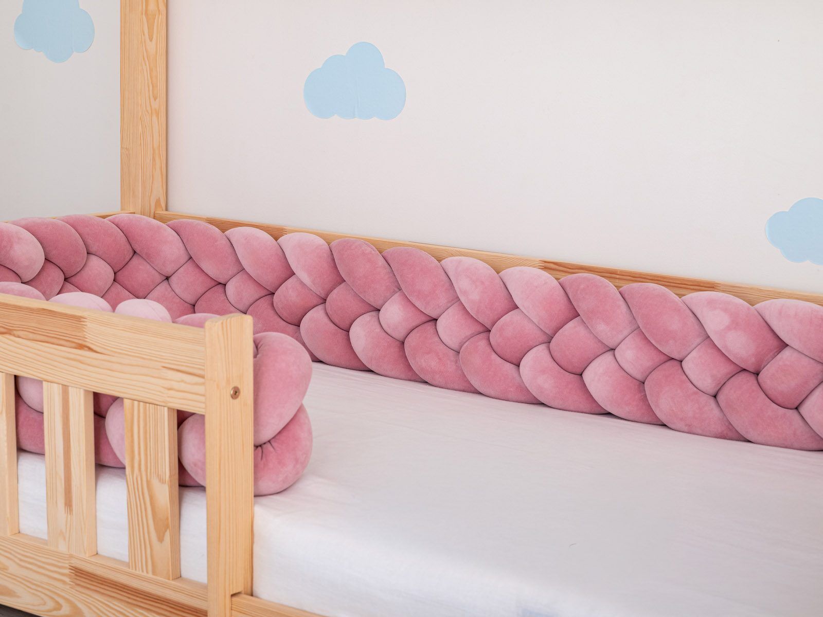 - In order to maintain the original shape, the bed bumper should be rolled and tied with ribbons in a few points – the braid ends are sewn together and will not become untied during washing,