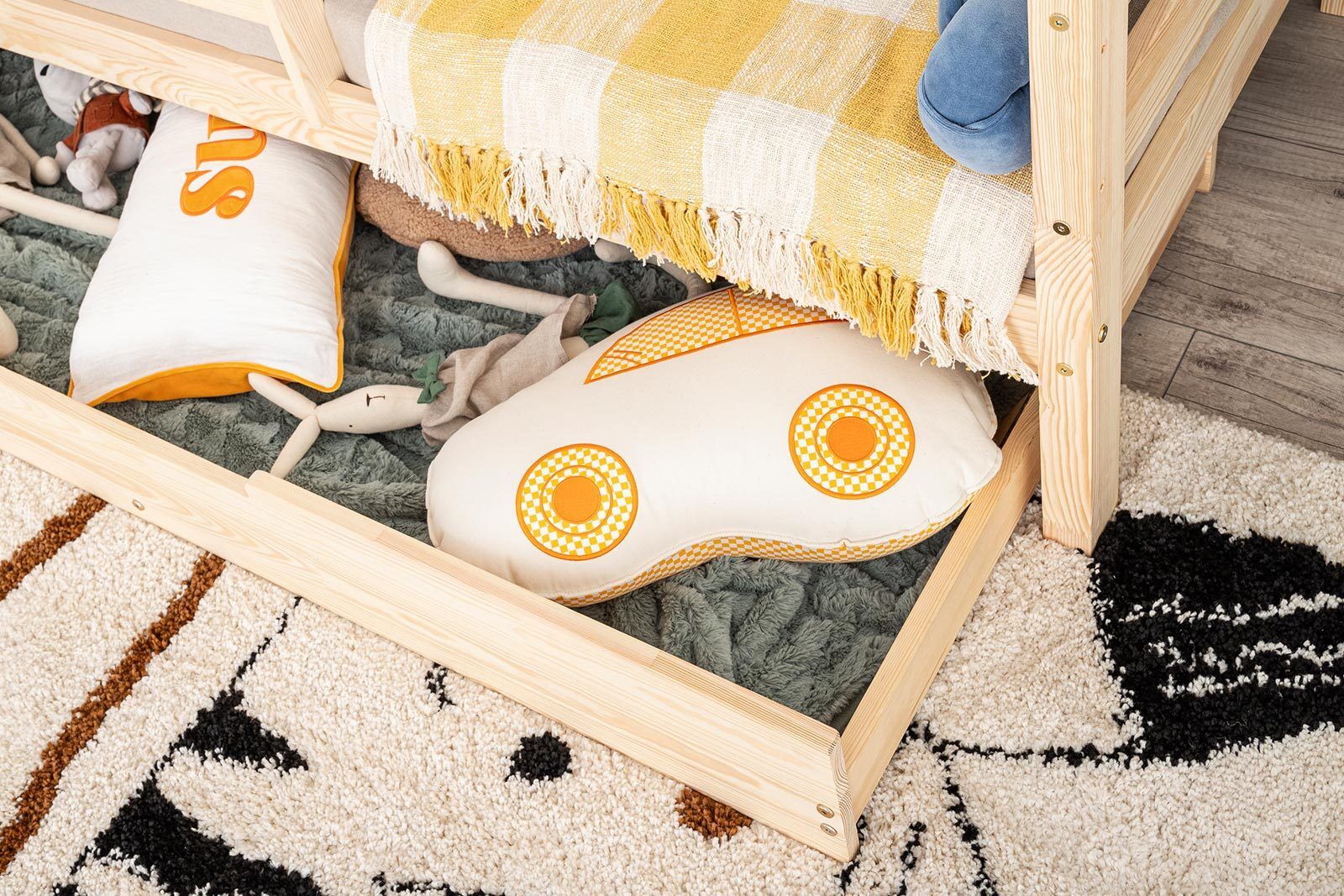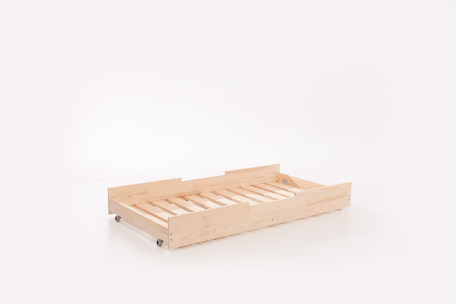 A drawer with a sleeping function (additional option) – the drawer does not have a uniform bottom. The bottom of the drawer is a frame made of flat planks. The drawer can be used as an additional place to sleep or to store bedding, for example. The drawer has wheels. The height of the drawer is 19cm.