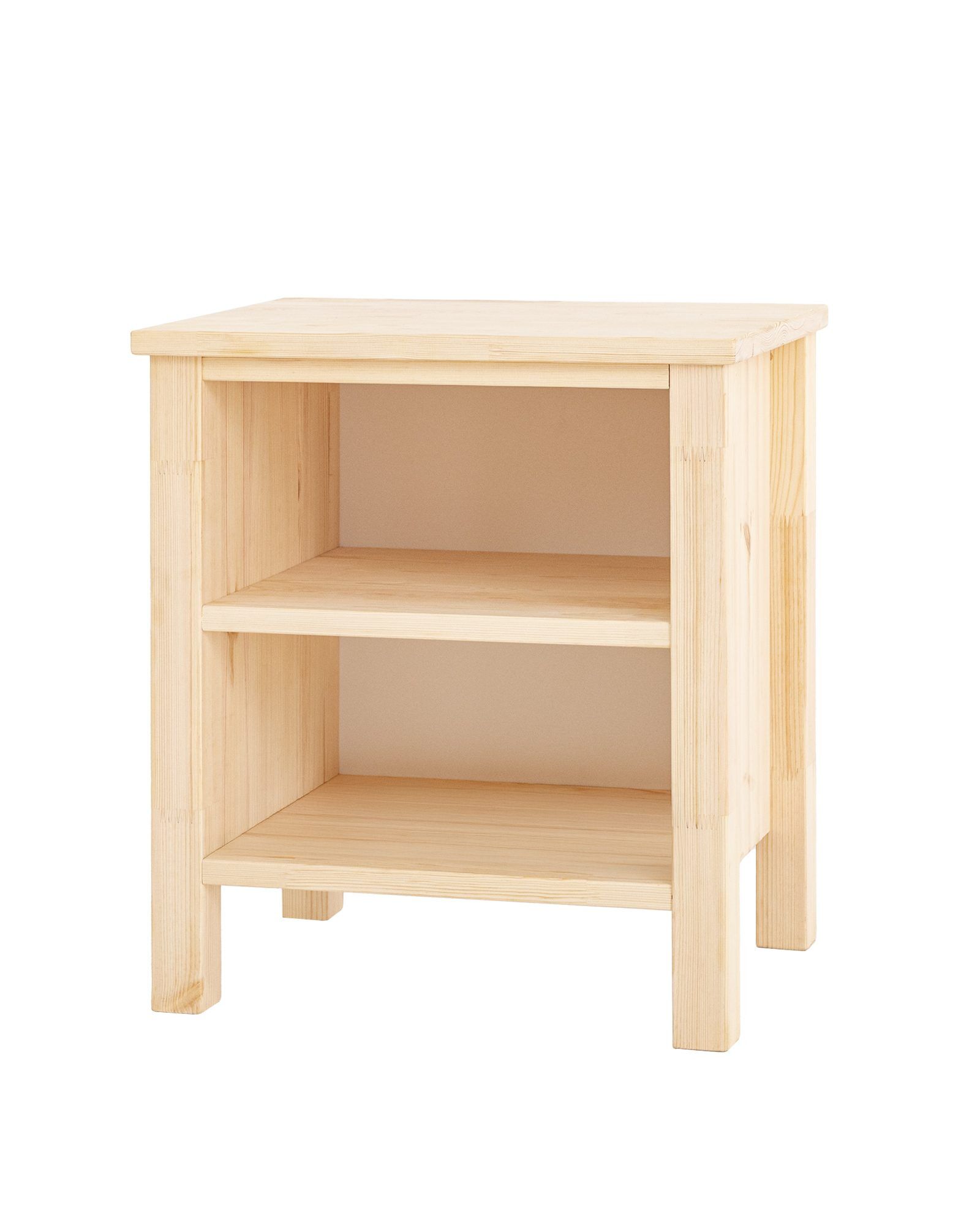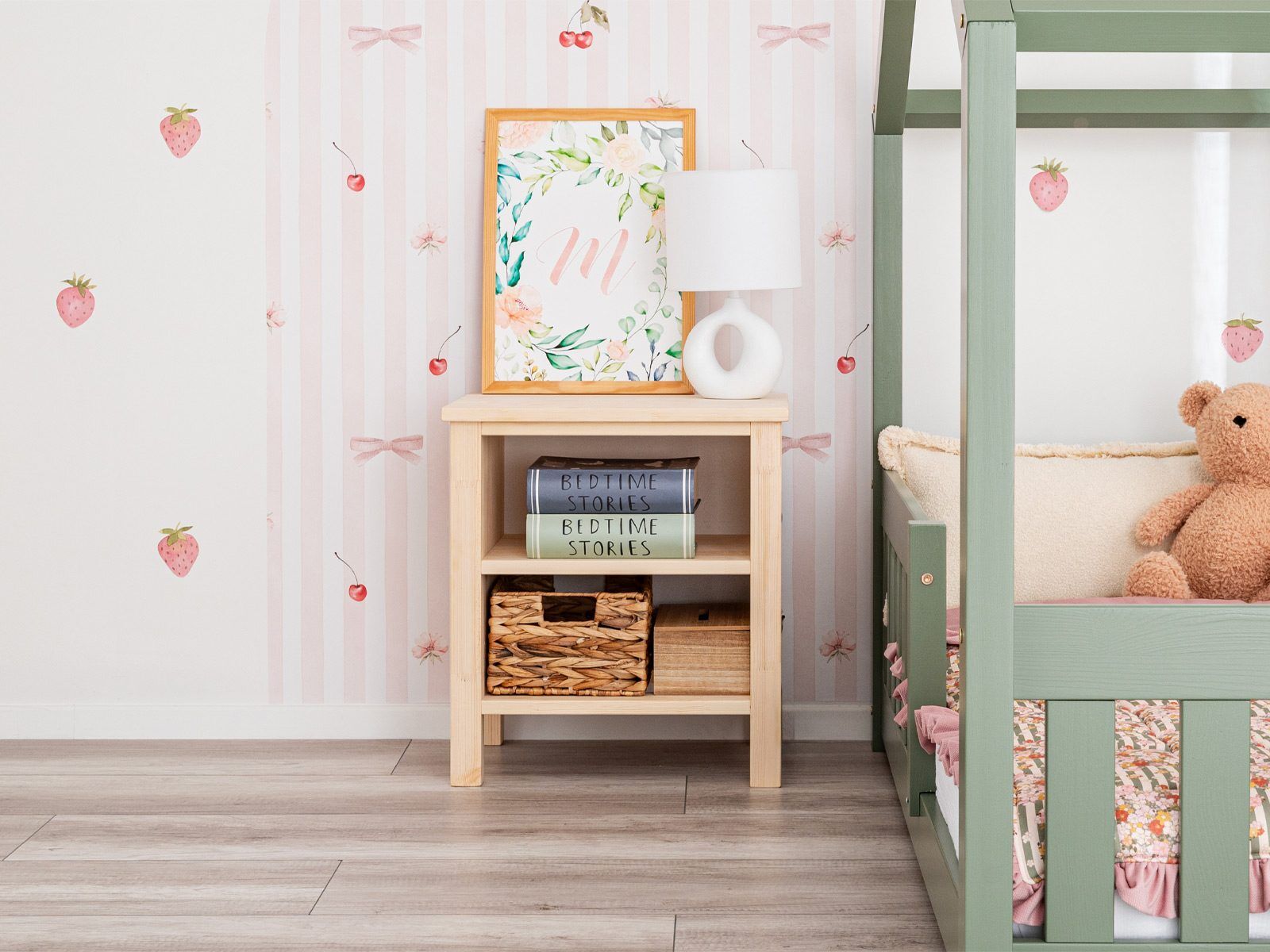 Two open shelves provide convenient space for books, toys, and decorations. Thanks to the open structure, everything is always within reach. This is especially appreciated by young children who, in the spirit of Montessori, enjoy and are encouraged to reach for their things independently. Made of solid pine wood, the table impresses with its natural look and durability, while its minimalist design makes it a perfect match for any bed and children’s room arrangement.